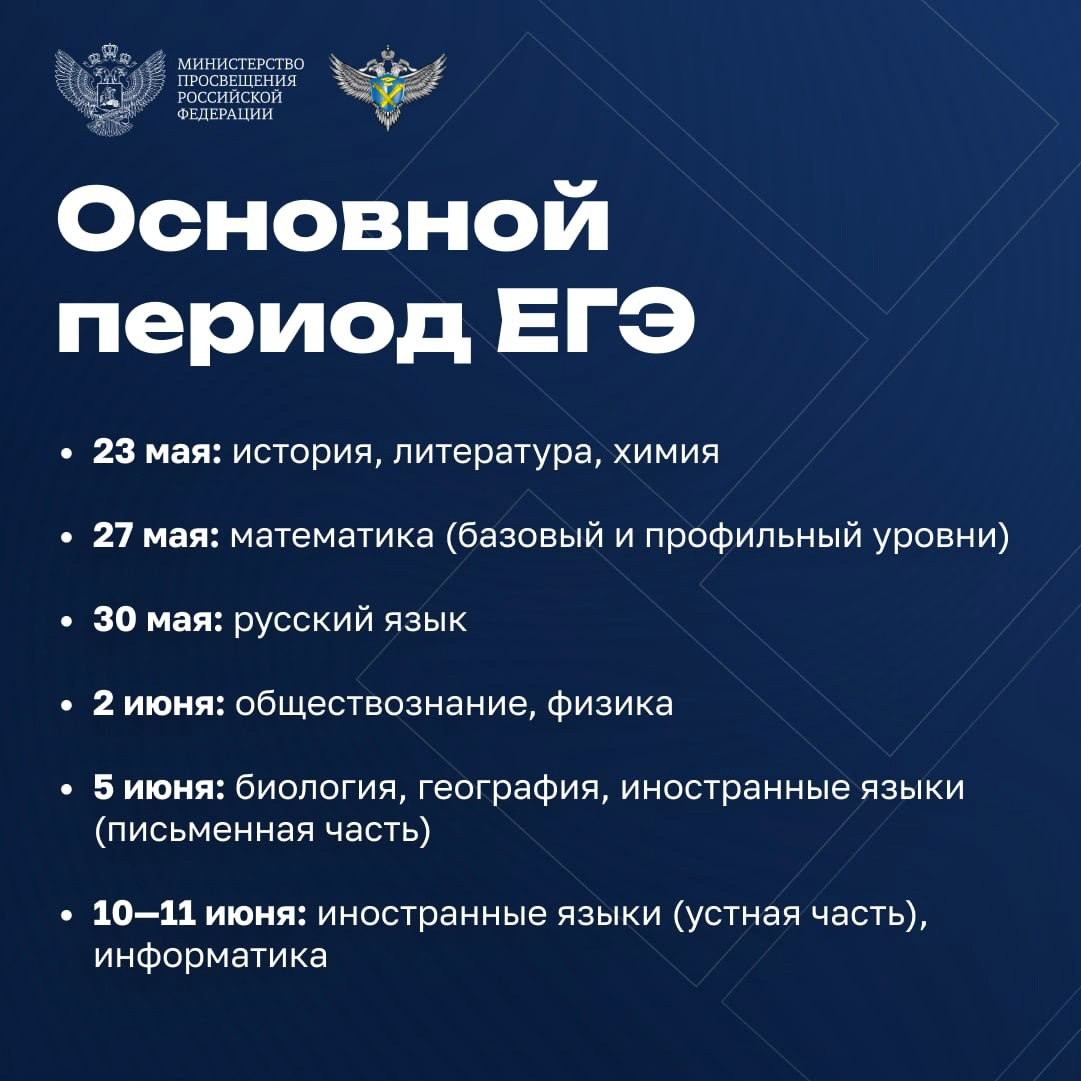 Минпросвещения и Рособрнадзор определили даты досрочного и основного периодов экзаменов, а также пересдач. Напоминаем, что все экзамены начинаются в 10:00 по местному времени.